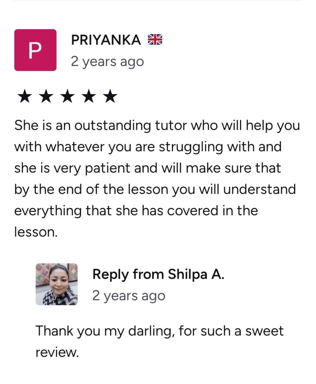 Shipla has been a very understanding and engaging teacher. She takes interesting examples to make sure that I remember the concepts, and focuses on my exact requirements with the language. I would highly recommend her lessons.