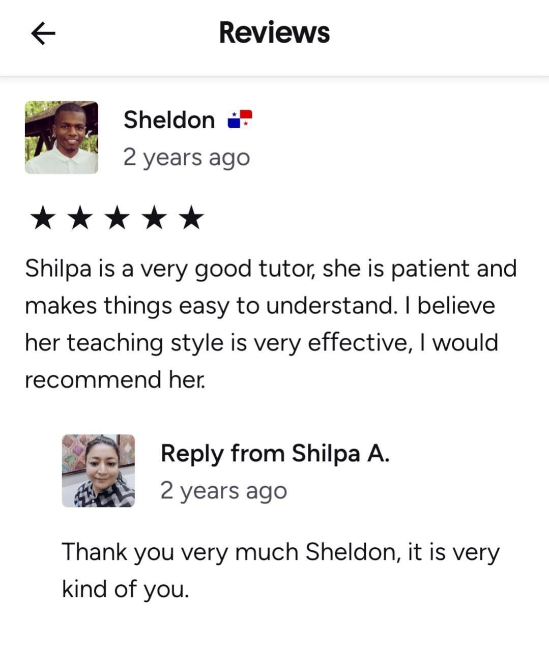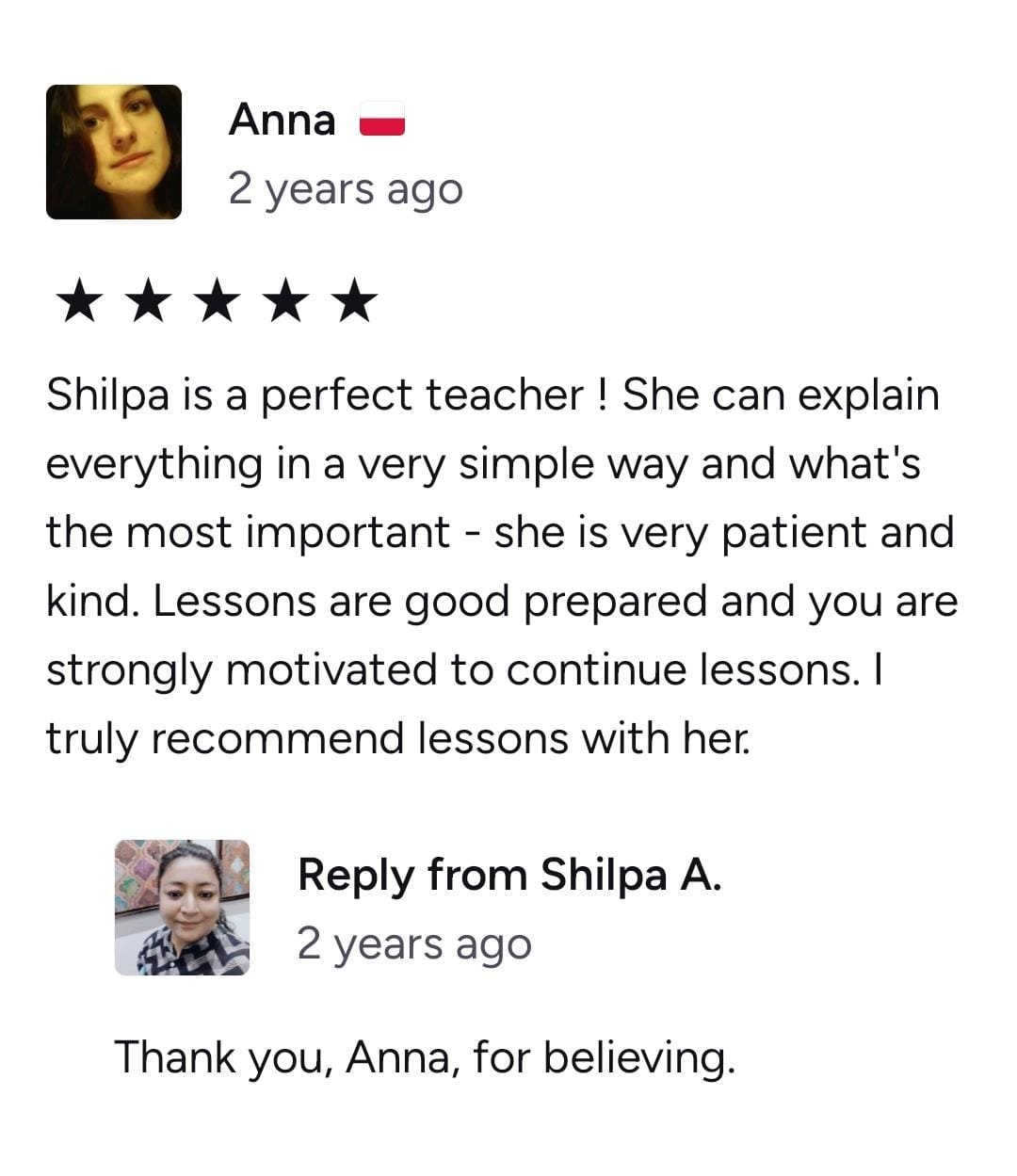 Ms Shilpa is an excellent teacher . As a beginner the language was very intimidating , she broke down the study into to simple understandable yet very effective lessons. Also she is patient and supportive