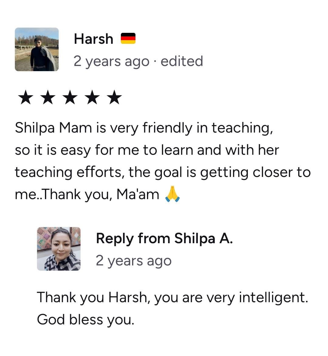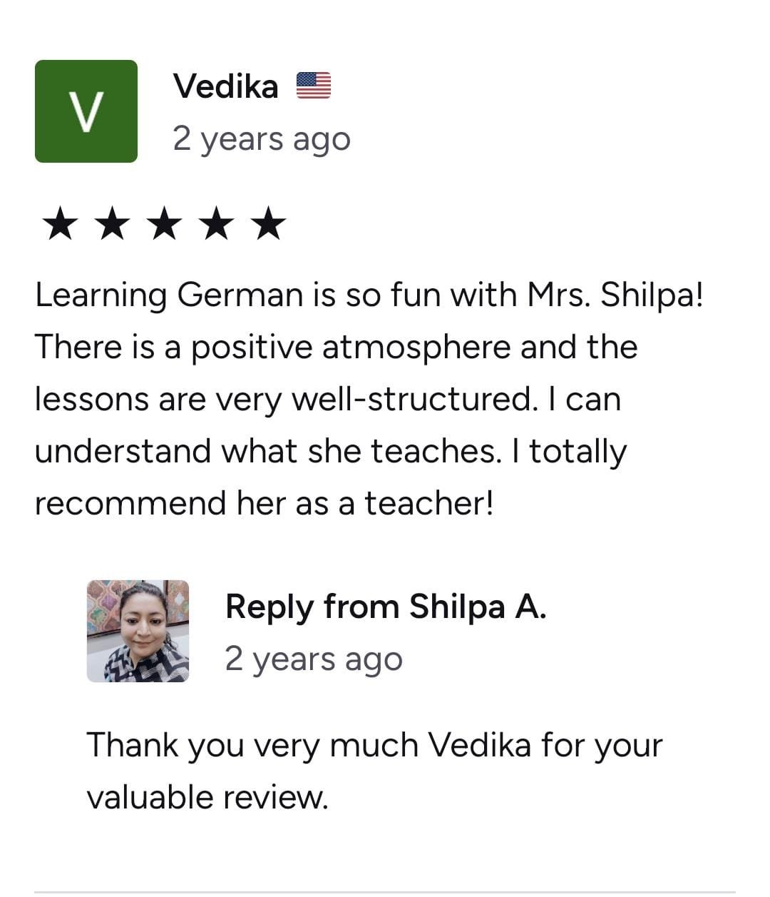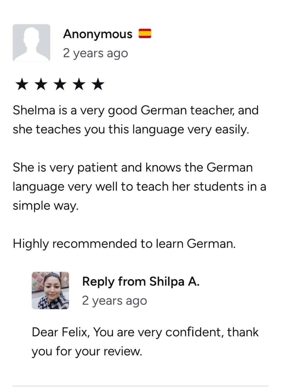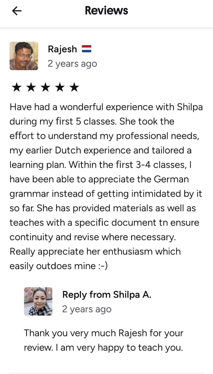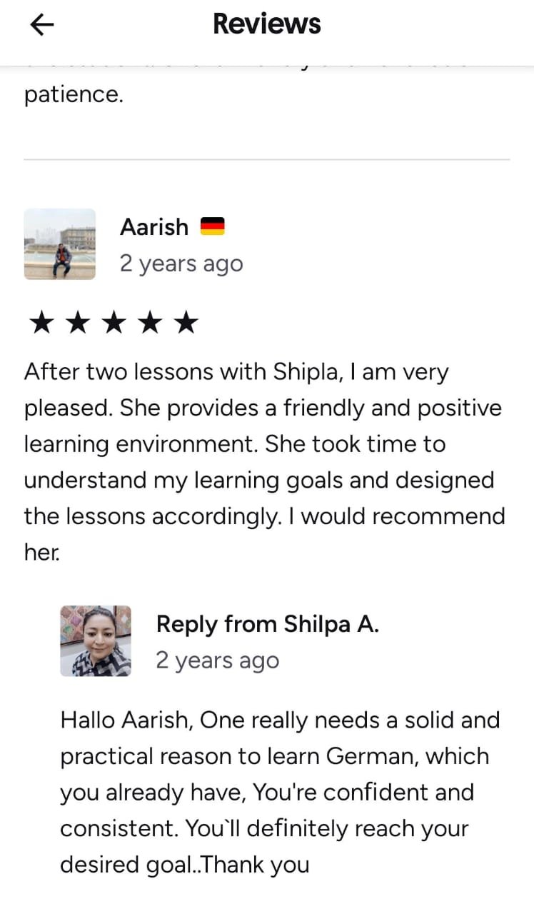 Shilpa Ma'am has been such a great teacher, helping me achieve all my academic goals in German. She can teach at all levels and is very kind and helpful. Thanks to her, I have improved a lot. Thank you so much, Ma'am!
