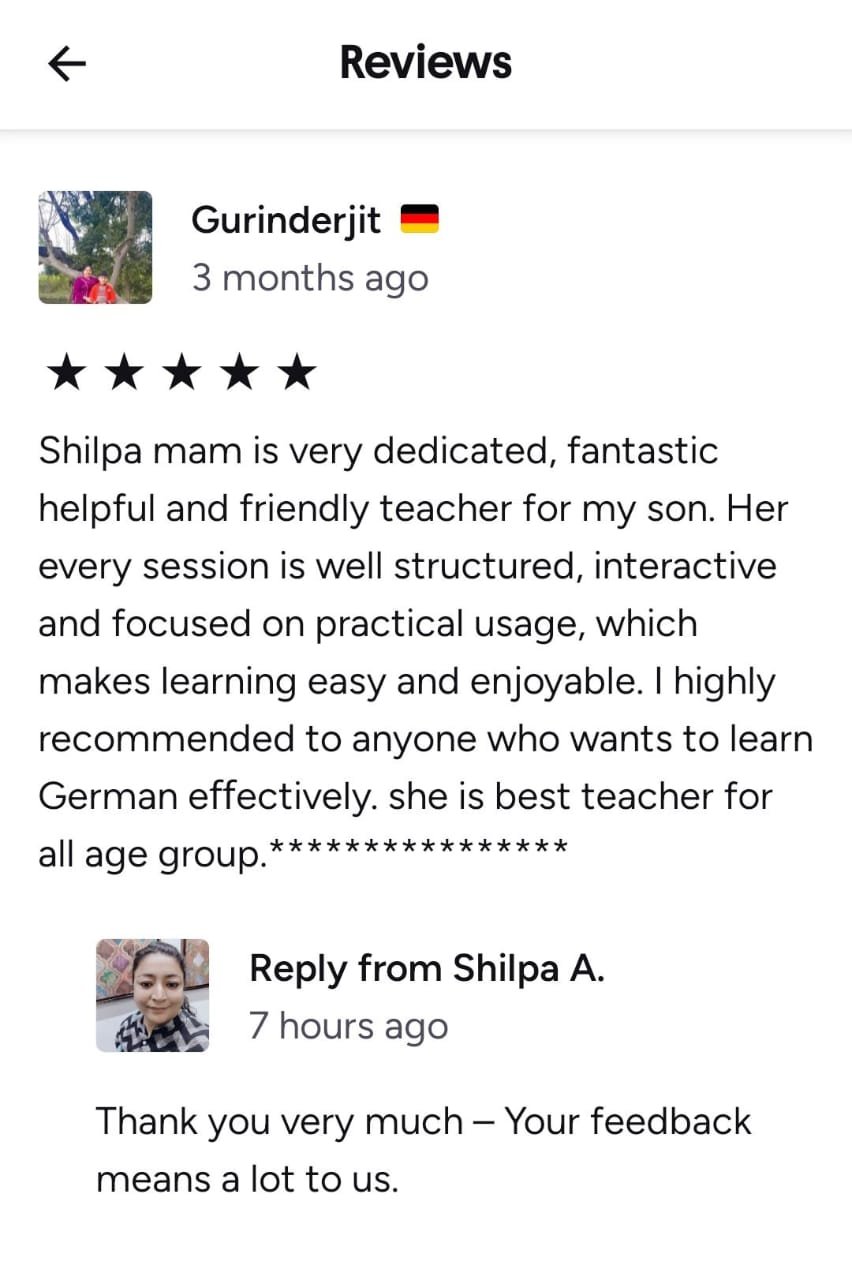 Shilpa mam is very dedicated, fantastic helpful and friendly teacher for my son. Her every session is well structured, interactive and focused on practical usage, which makes learning easy and enjoyable. I highly recommended to anyone who wants to learn German effectively. she is best teacher for all age group.**************